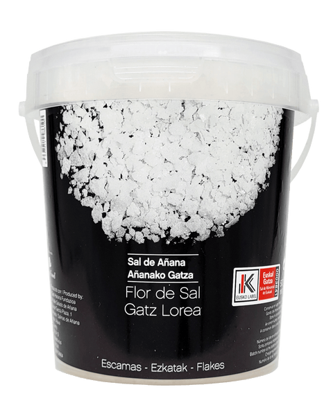 Das Topprodukt von Sal de Añana. Da der natürliche Salzgrad der Salinen derart hoch ist, bildet sich das Flor de Sal innerhalb kürzester Zeit an der Sonne. Dadurch ist die Körnung grobflockig und sehr knackig im Biss - eine absolute Rarität.